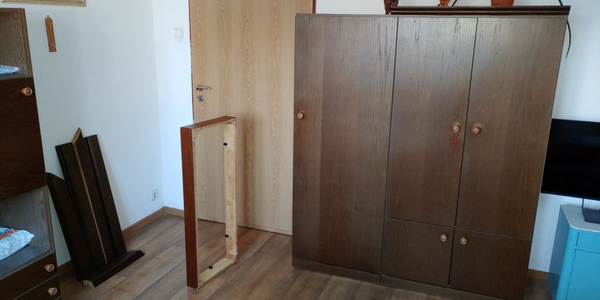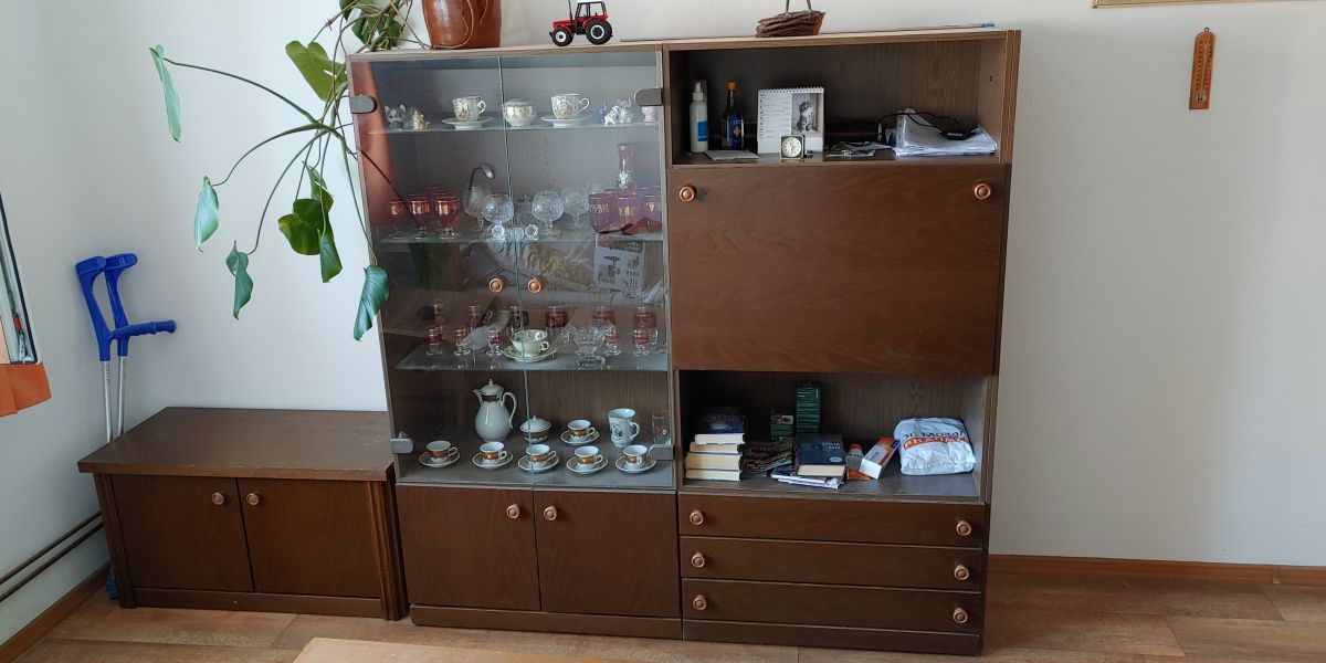 daruji za odvoz starou tmavě hnědou obývací stěnu z dřevotřísky, výroba ještě v DDR (dle štítku). Skříňky jsou od sebe oddělitelné. Součastí jsou ozdobné lišty, které sloužily zřejmě jako přechodové k horním nástavcům (ty již nejsou součástí nabízené sestavy). Boky a vršky skříní nejsou v dekoru, ale pouze v obyč béžové, součástí je ale jedna deska v dekoru, která se dá na bok přidělat (takže bude bok skříně pohledový). Stůl není vyloženě součástí nabídky, ale na přání je možné dát ho i se stěnou. Dekorace nejsou součástí nabídky.