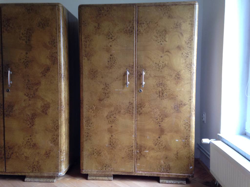 Skříně jsou plně funkční. Jedna má jen tyč na pověšení. Druhá je větší, má i poličky na oblečení.