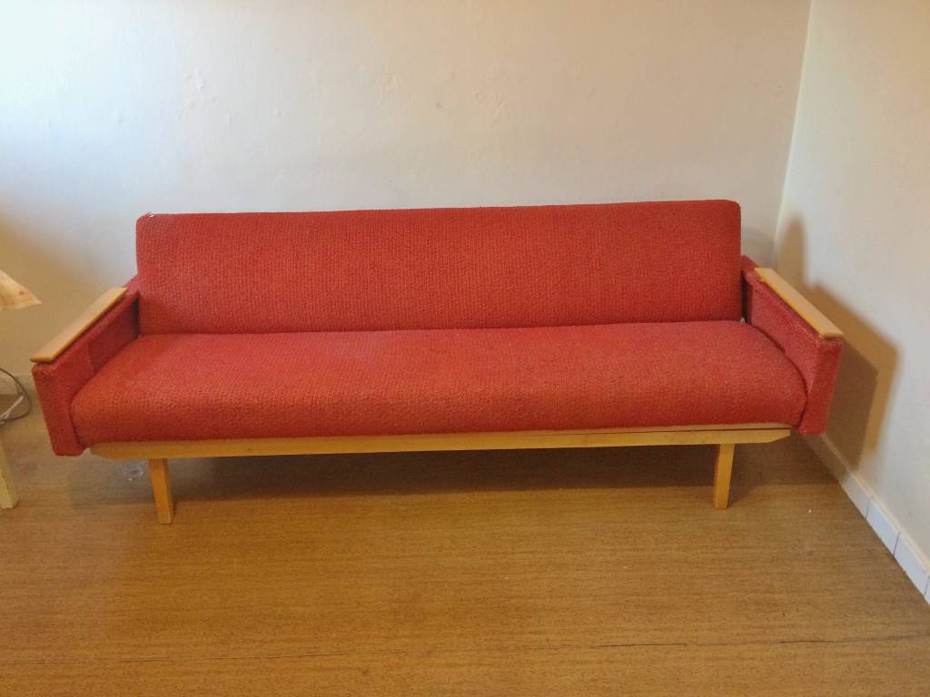 Dřevěná pohovka, plně funkční, čistá. Lze velmi jednoduše rozložit na 1,5 lůžko. Stačí nově přečalounit ...