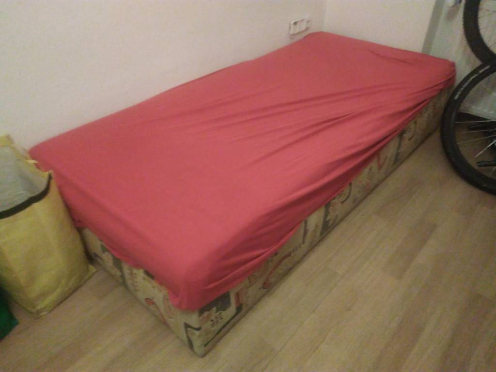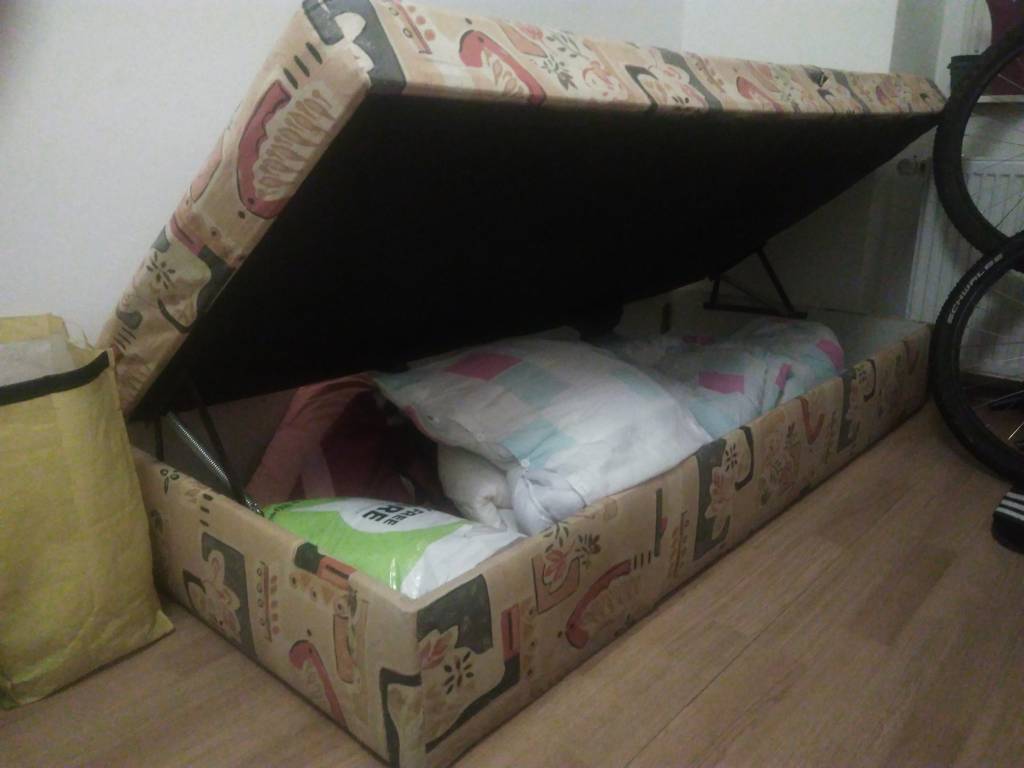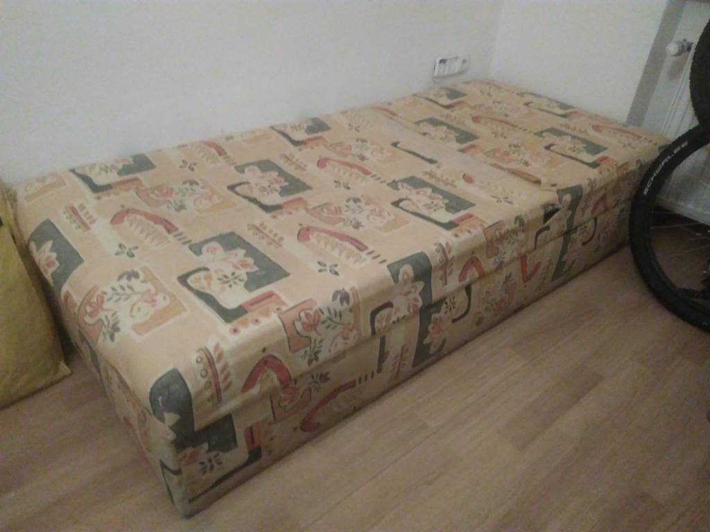 Pohodlné jednolůžko, odklápěcí vrchní část -úložný prostor. Čalounění je napříč postele roztržené, ale nemá to žádný vliv na funkčnost -při potažení prostěradlem se to zcela skryje a nelze to ani na dotek poznat.