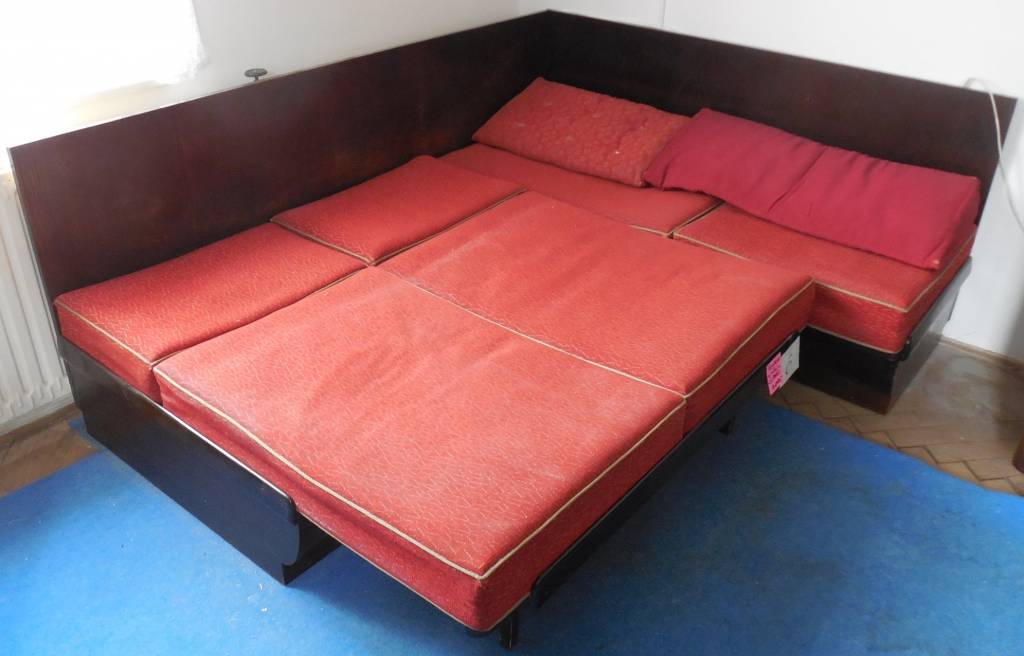 Na masívní dřevěné kostře, se zadními deskami v tmavé dýze (ořech). Polštáře proleželé - možnost jejich výměny. ROZMĚRY: Délka =193cm, šířka 155cm.