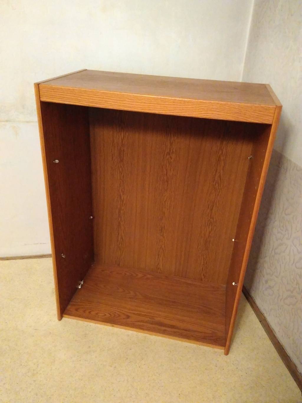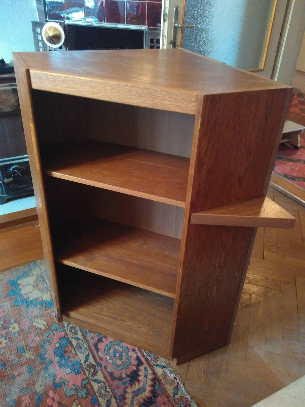 Rohová pracovní deska, která má délku 120cm (1 pracovní místo). Na jedné straně skříňka. Materiál dřevotřísková deska dýhovaná. Druhá skříňka je ve stejné povrchové úpravě (bohužel bez polic). ROZMĚRY: Délka 160cm, šířka 70cm, výška 90cm.