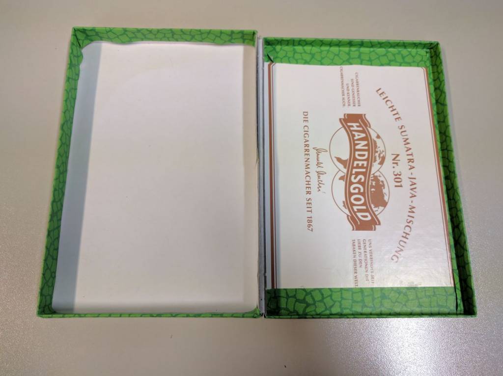 Krabička od doutníků, potažená papírem. Vhodná na drobnosti, např. náušnice.