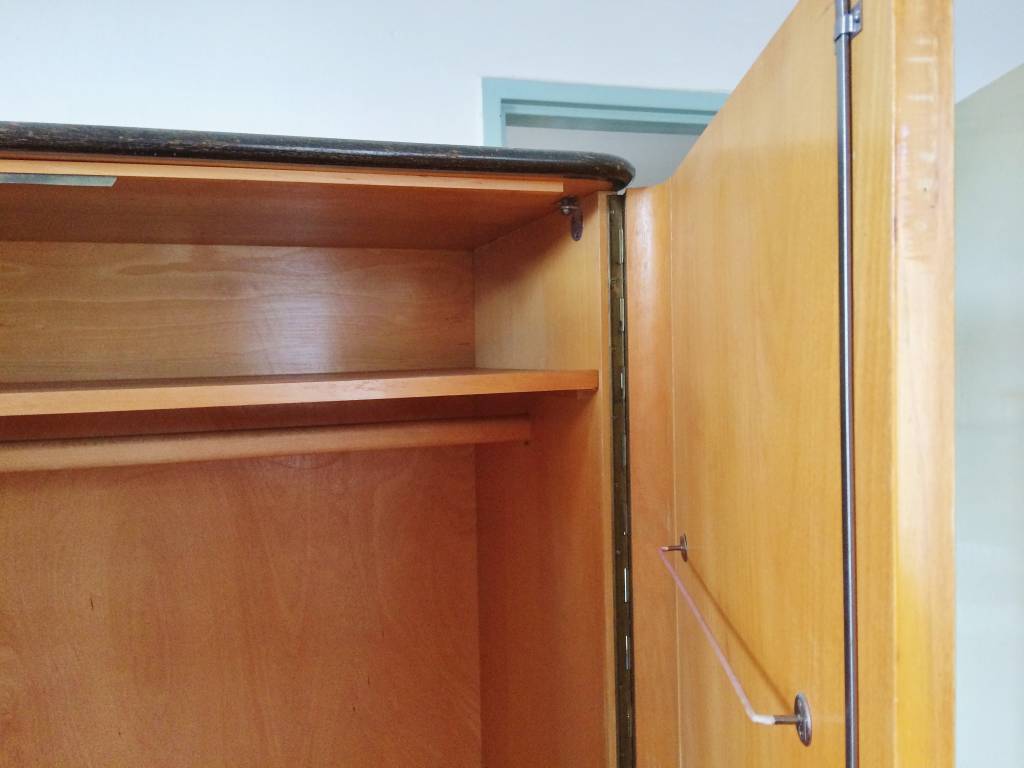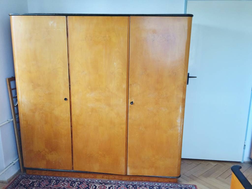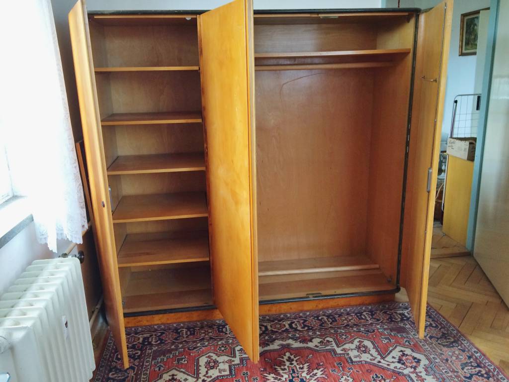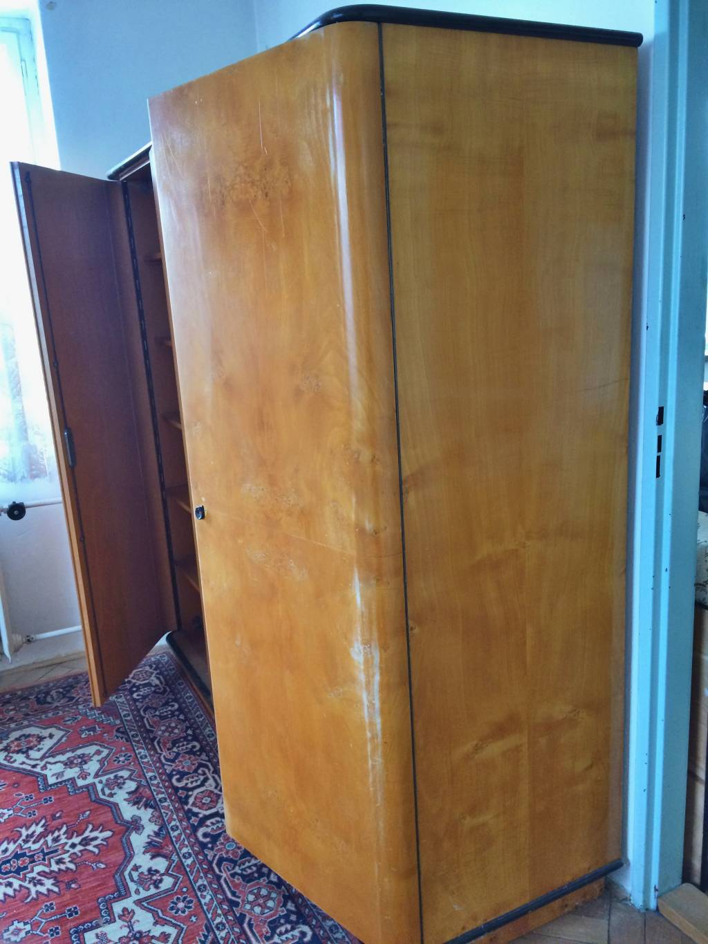 Starší šatní skříň. Sice stará, ale masivní, čistá, nepoškozená. Vlevo část s poličkami a vpravo část s jednou policí a tyčí na ramínka.