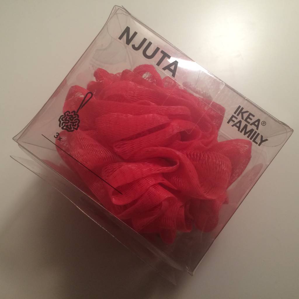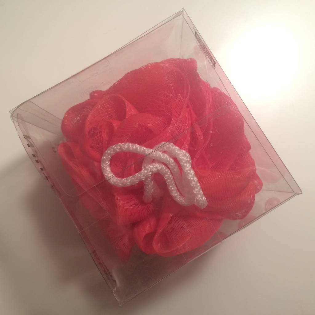 Růžová žínka je stále v původním obalu, nepoužívaná.
