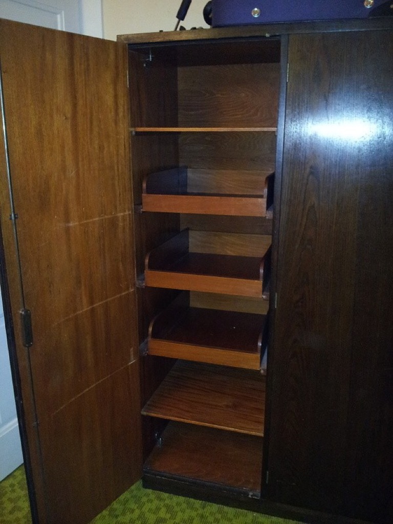 Užší část vlevo - police + šuplíky, širší dvoudvéřová vpravo - horní police + ramínková