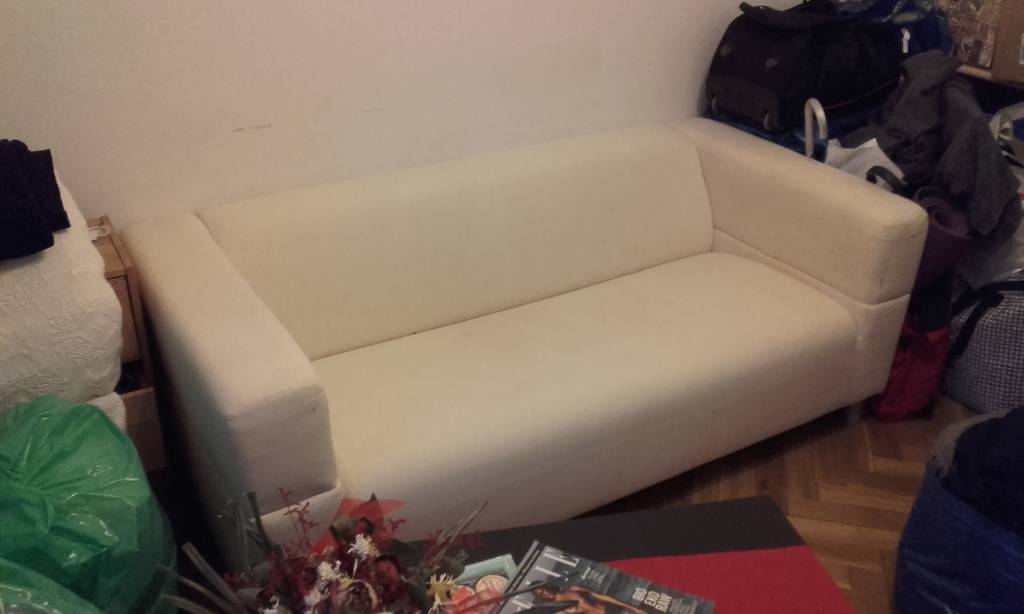 Bílý, používaný, cca pro 3 osoby, není rozkládací, nový potah možno dokoupit v IKEA (myslím)