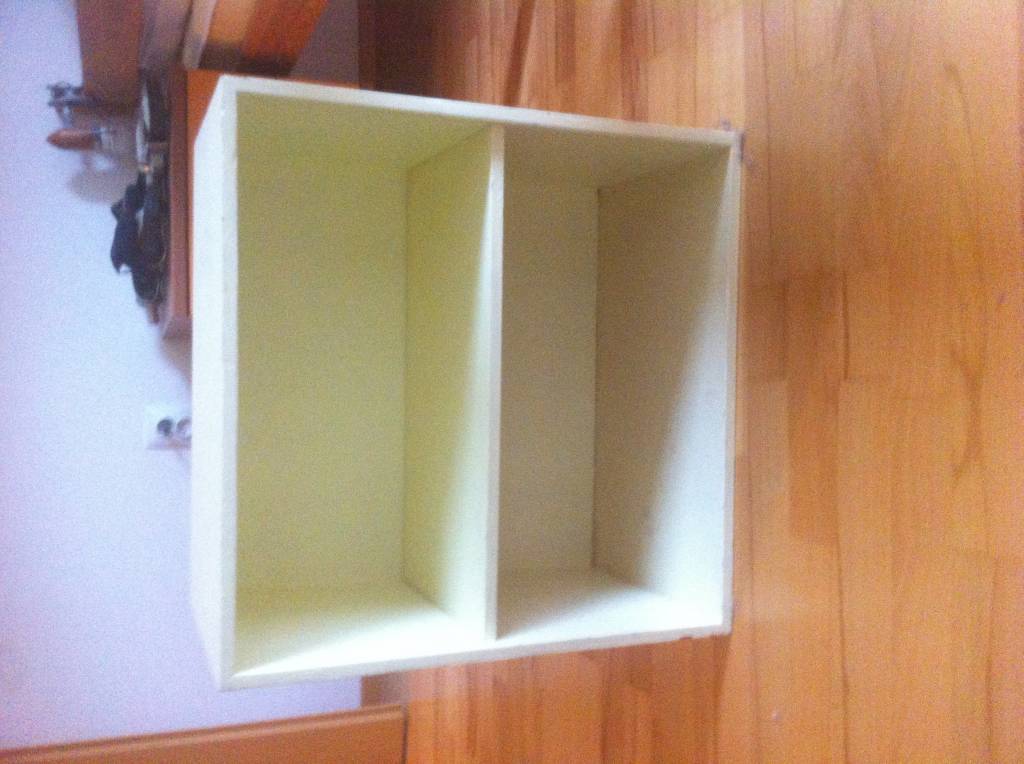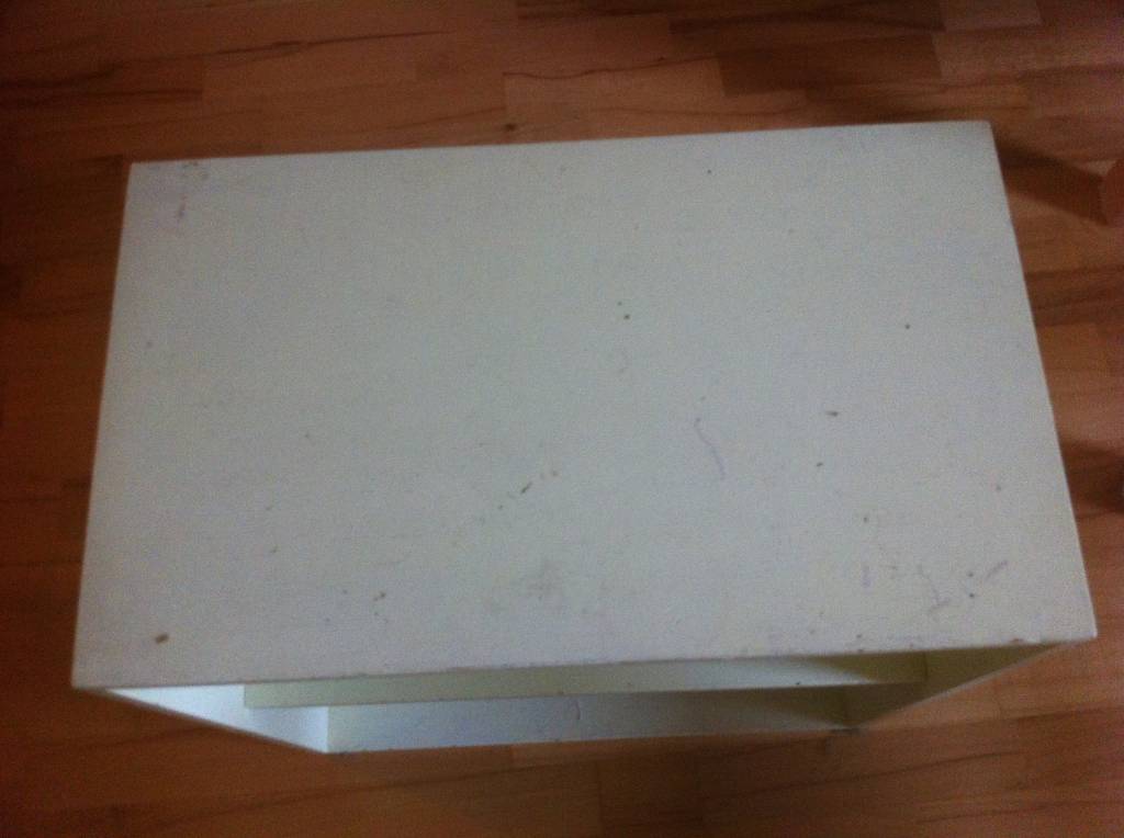 polička/skříňka/noční stolek nalakovaný na světle žlutou, místy špinavý od barev atd.