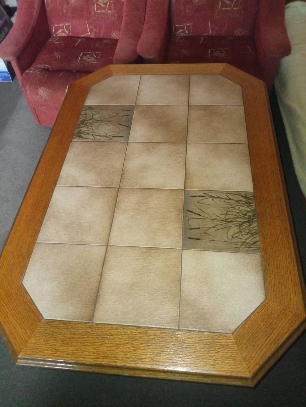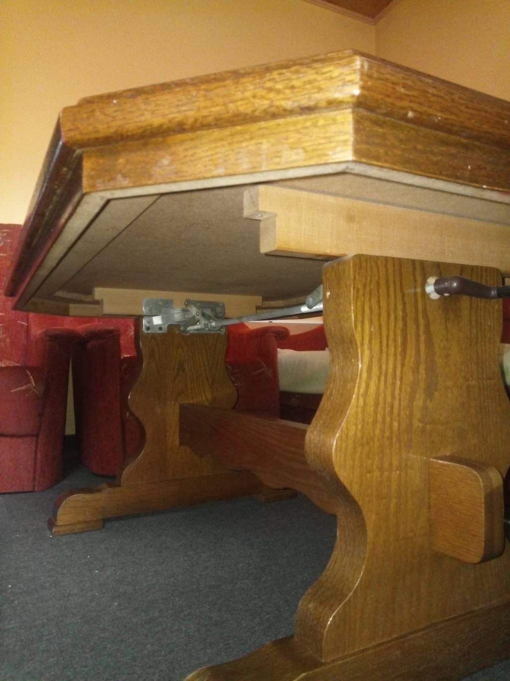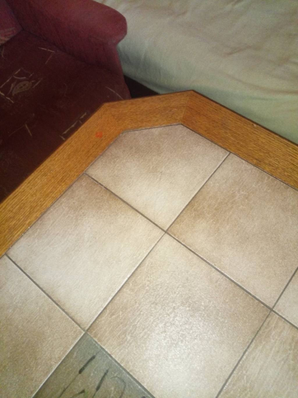 Světle hnědý dřevěný stolek do obývacího pokoje- Vhodné pro lidi v nájmu, na chaty, zahrady. Rozměry (délka/šířka/výška v cm): 121/81/57 Vrchní část je tvořena obkladem. Jedna obkladačka je prasklá, není moc vidět. Mechanismus na úpravu výšky stolu je nefunkční. Nemá vliv na stabilitu stolu. Snadný odvoz (přízemí, Teplice-Prosetice).