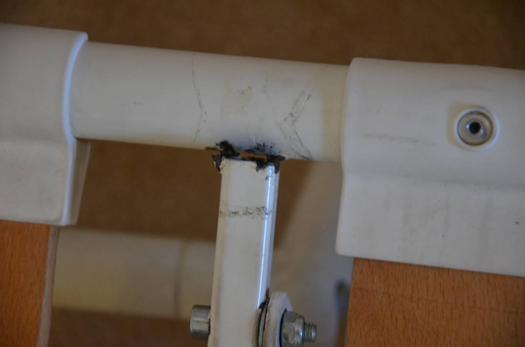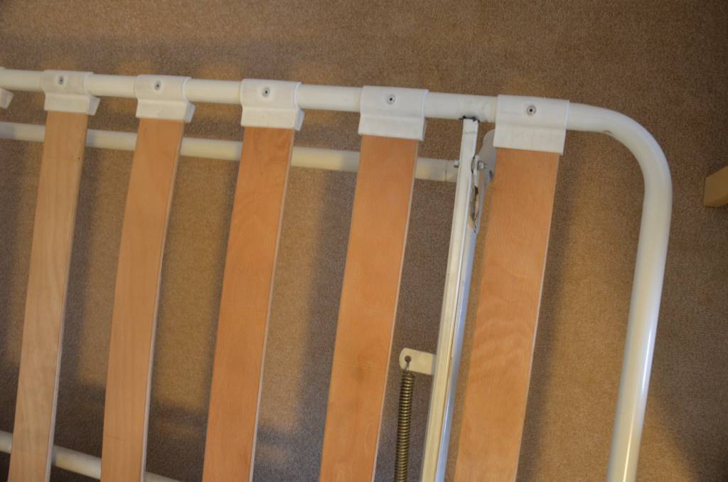 Bílá rozkládací pohovka, poškozená matrace (vykousáná od psa), prasklý rám v jednom bodě. Nic z toho nemá na funkci ani vzhled vliv