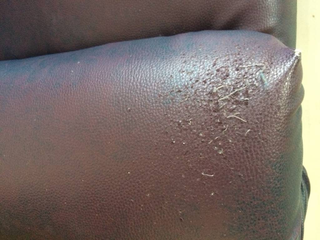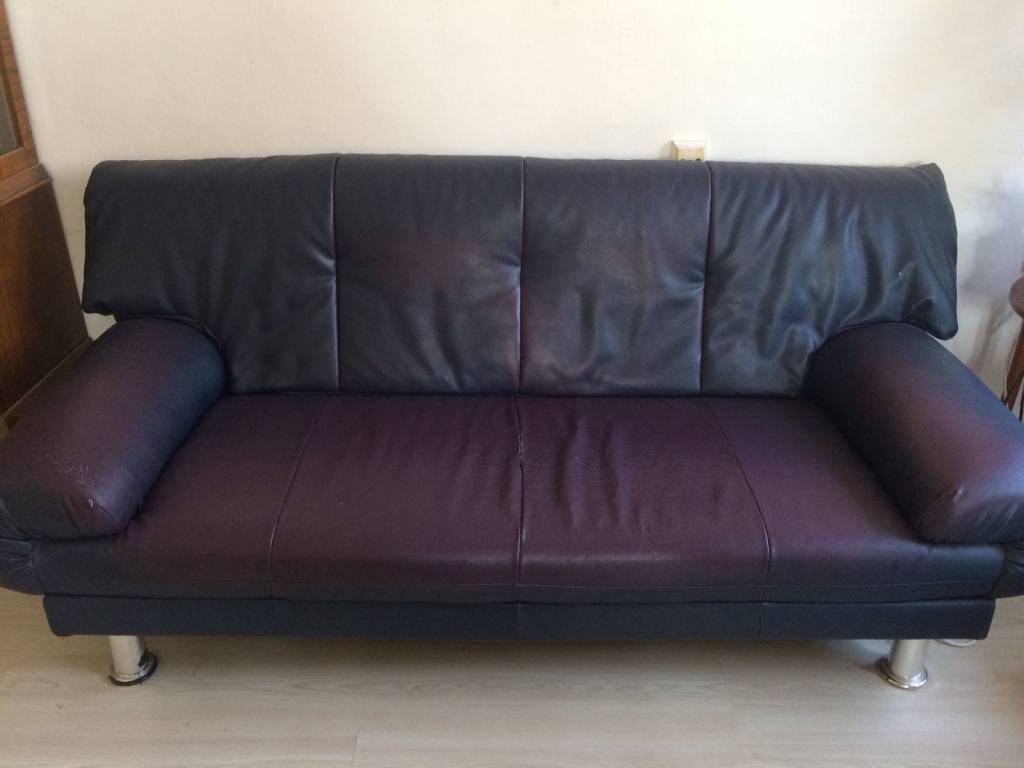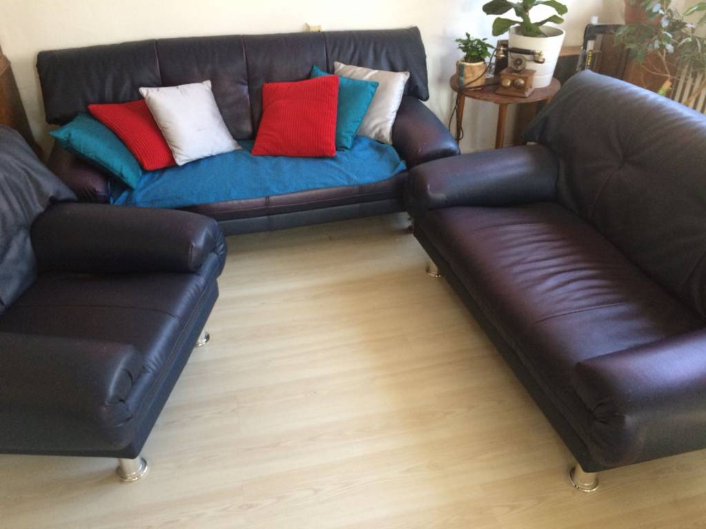 Souprava se sklada ze tri dilu: trojsedacka, dvojsedacka a kreslo. Potah je tmave modra kozenka, v mistech poskozena od kocoura - specialne operadla. Barva je na nekterych sedacich mistech vysisovana do fialova. Kdyz se na mista k sezeni da prehoz, sedacka vypada relativne dobre. Je pohodlna.